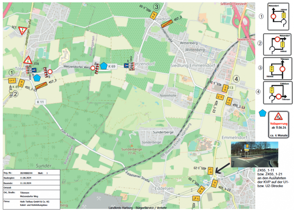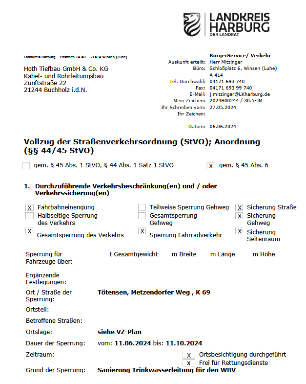 - Eine Vollsperrung des Metzendorfer Wegs (K69) aufgrund von Sanierungsarbeiten an den Trinkwasserleitungen: Diese wird sich voraussichtlich über 4 Monate (geplant: 11.06.-11.10.2024) hinziehen (s. Bekanntmachung unten).