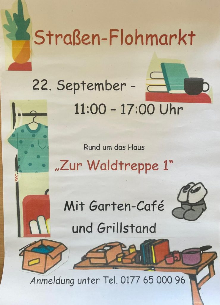 Am 22.09.2024 verwandelt sich die Umgebung von Haus Nr. 1 in der Straße zur Waldtreppe (Tötensen) erneut in einen Straßenflohmarkt. Zum kleinen Preis werden dort zwischen 11h und 17h verschiedenste Waren feilgeboten.